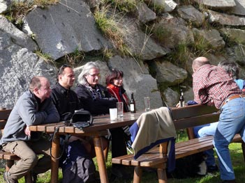 Endlich alle beisammen, wenn auch unsere Freunde aus Schweden die Aktion vorzeitig abbrachen. Dafür tranken wir auf ihr Wohl und standen vor einem gut gedecktem Tisch aus Fels mit Hirschwürsten, verschiedenen Wein, Käse, Speck und einem Gipfelschnaps. |